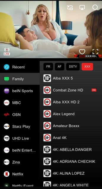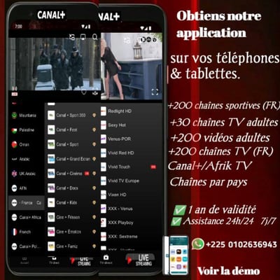 L’application intègre un espace adulte complet et premium, avec plus de 30 chaînes dédiées et plus de 200 vidéos adultes disponibles, pour une expérience privée, fluide et de haute qualité.